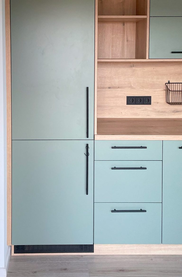 Moderne Einbauküche mit salbeigrünen Fronten, Holzarbeitsplatte, offenen und geschlossenen Hängeregalen und schwarzen Griffen für ein zeitloses Design.